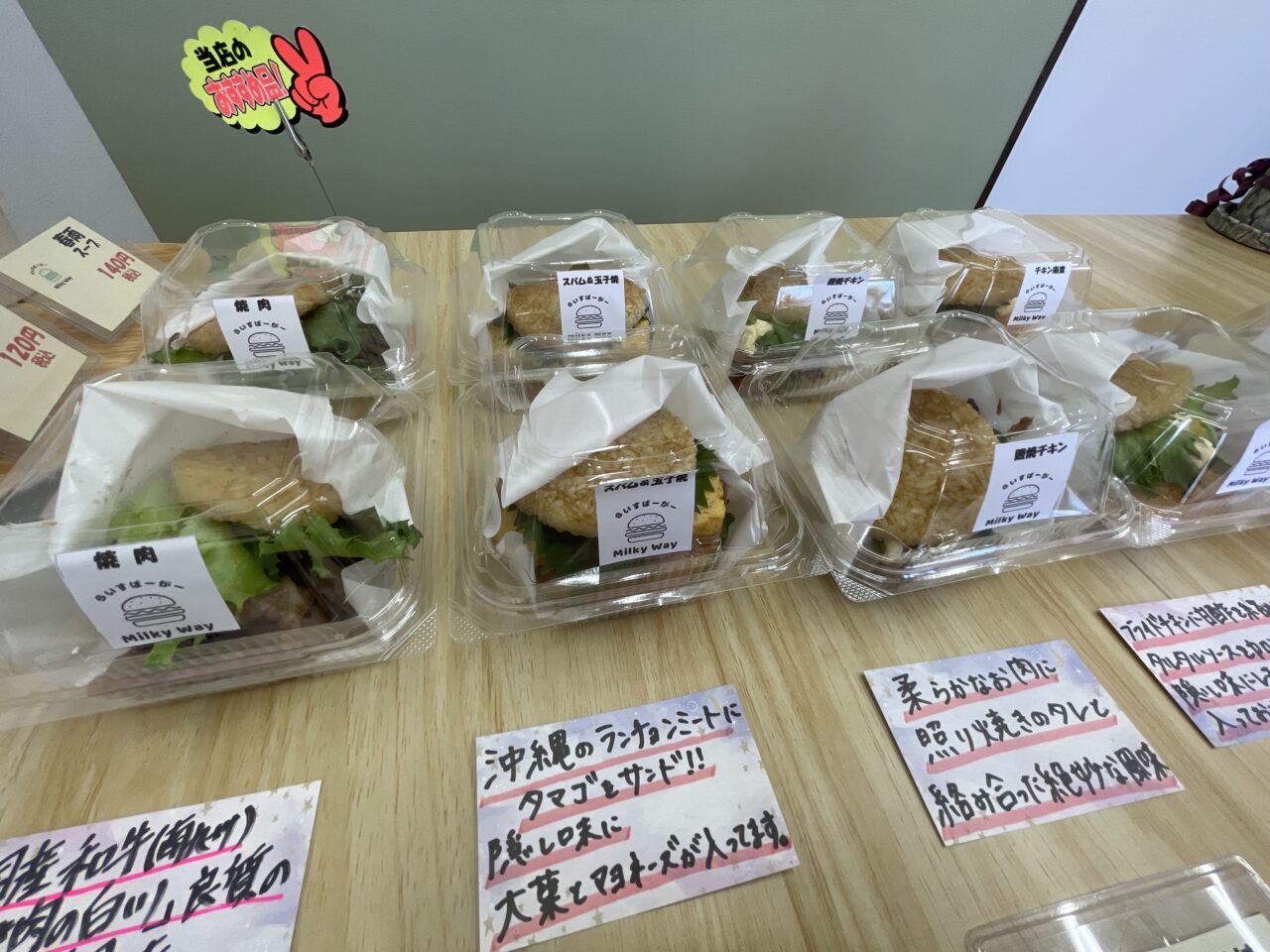 焼肉・スパム&玉子焼き・照焼チキン・チキン南蛮・エビカツ・アジフライ・ササミしそカツなど。