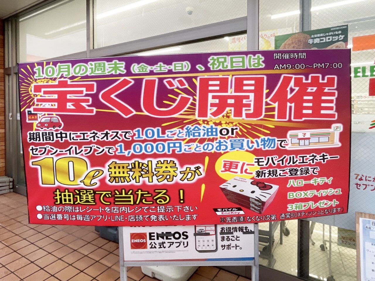 【姶良市】ガソリン10リットルが当たる!「セブン-イレブン 姶良総合運動公園前店」で、10月の週末(金・土・日)限定「宝くじ」開催中