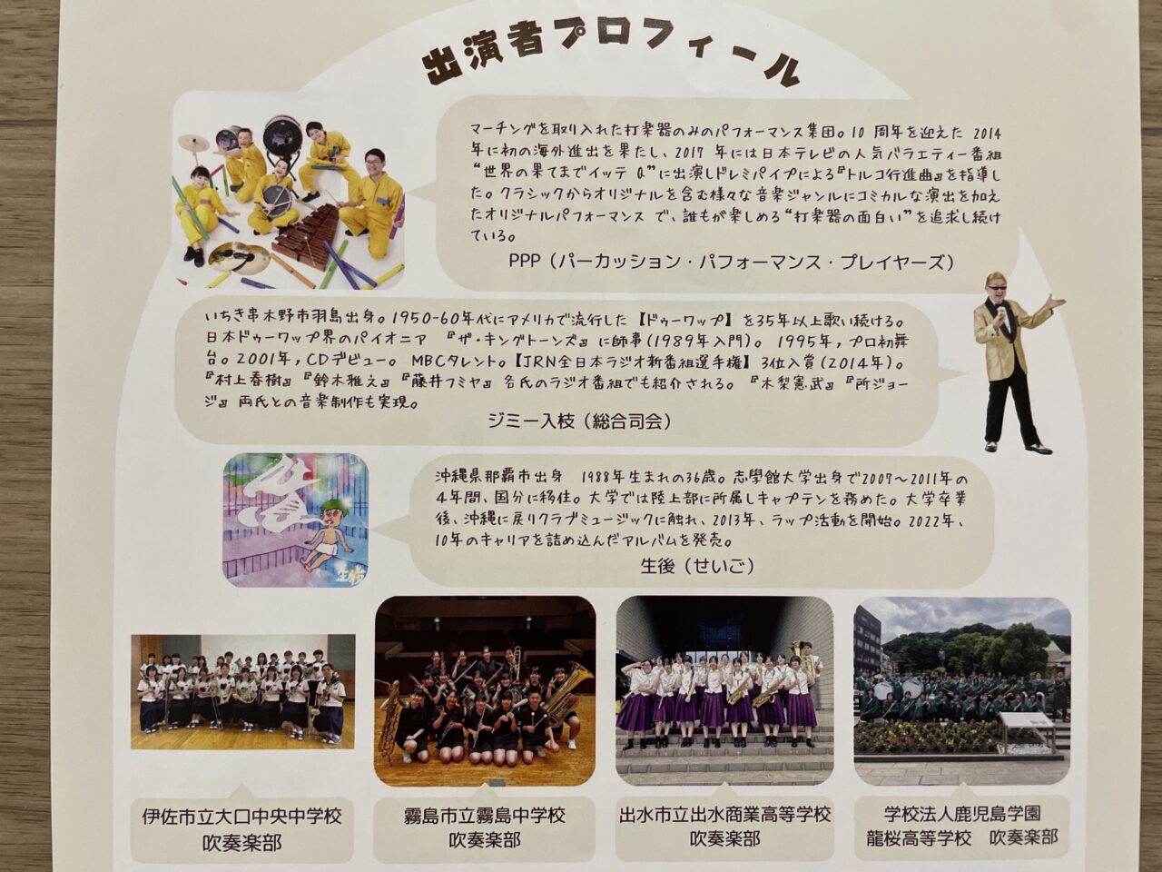 総合司会は、MBCタレントのジミー入枝さん、特別ゲストには、Percussion Performance Players、略してPPP(ピーピーピー)がやってきますよ。