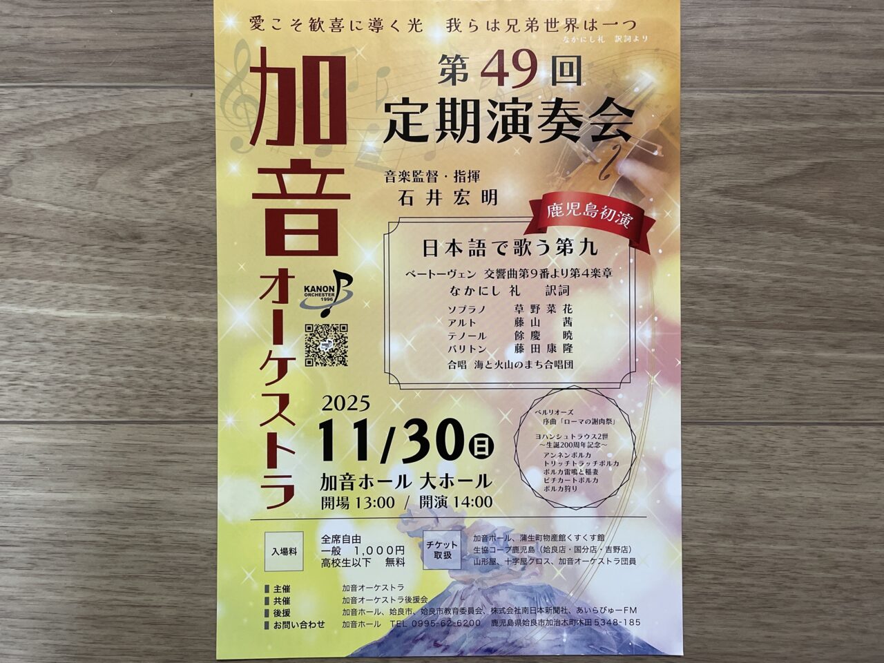 「日本語で歌う第九」が鹿児島初演なのだそう。音響の良い空間で音楽を楽しんでみてはいかがですか。※チケットやお問い合せは加音ホールへ。