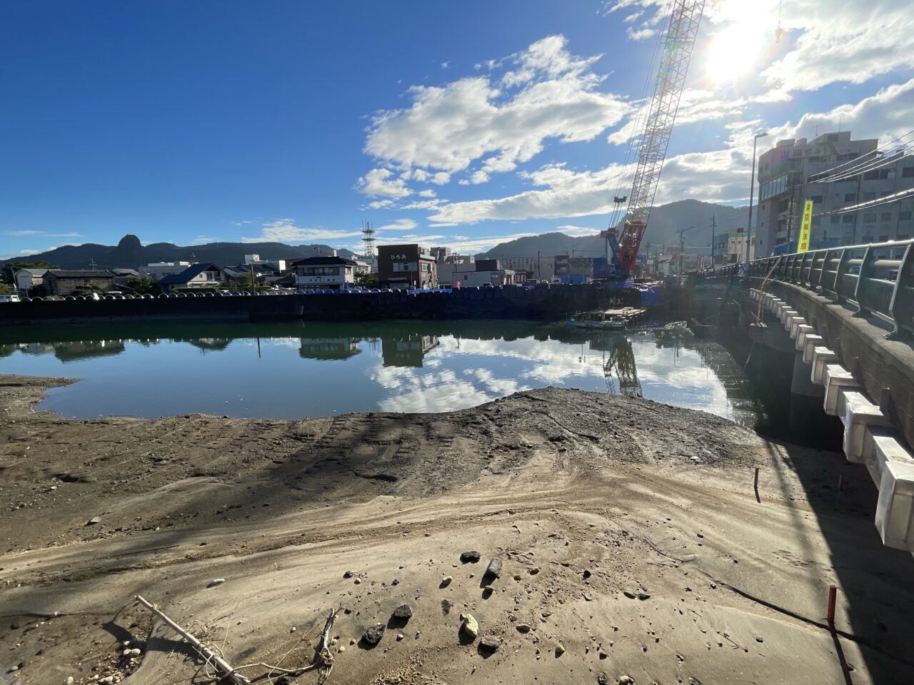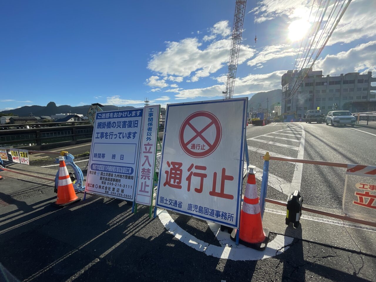 2025年8月の豪雨災害により、長らく全面通行止めになっていた加治木町の網掛橋が、2025年11月9日(日)10時に通行止めが解除され、通行できるようになります。国土交通省より発表がありました。画像は2025年10月中旬、復旧工事中の網掛橋です。