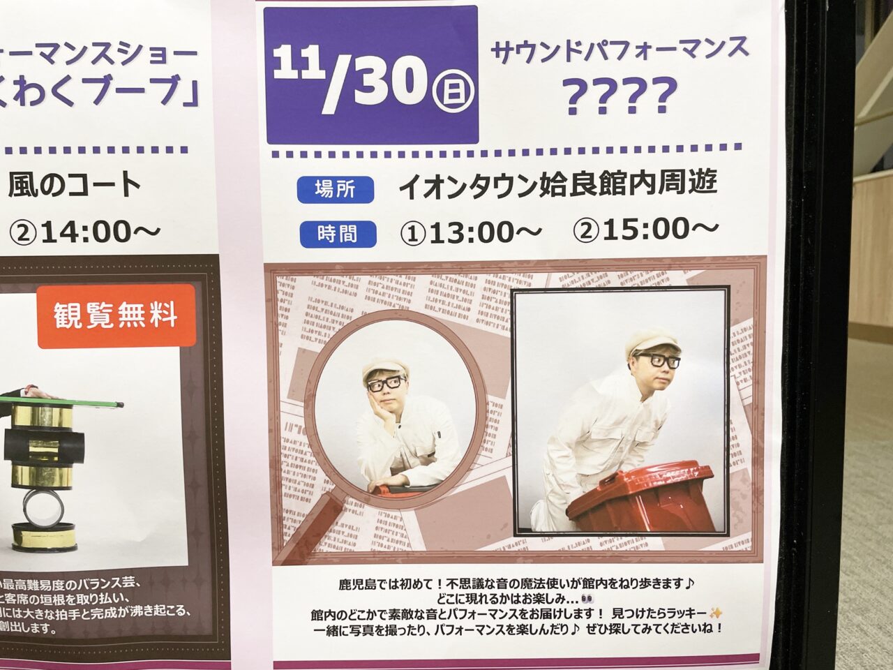 2025年11月30日(日)、「イオンタウン姶良」では2つのパフォーマンスショーが開催されるそうです。大道芸人「わくわくブーブ」による最高難易度のバランス芸と、鹿児島では初めての、不思議な音の魔法使いが館内を練り歩く「サウンドパフォーマンス」の2つです。