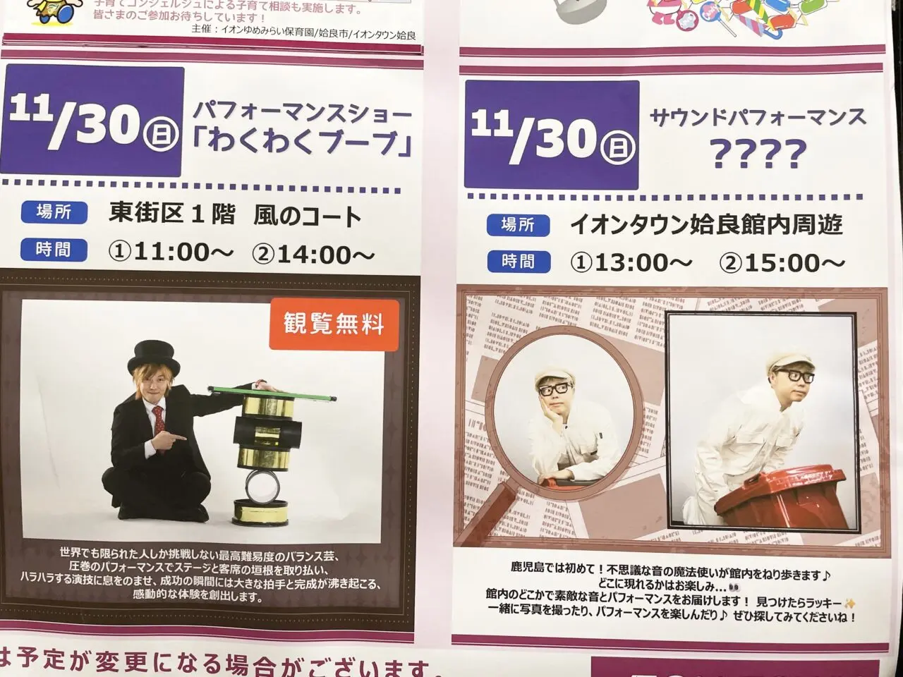 【姶良市】11月30日(日)「イオンタウン姶良」で、バランス芸「わくわくブーブ」と「サウンドパフォーマンス」が開催されます