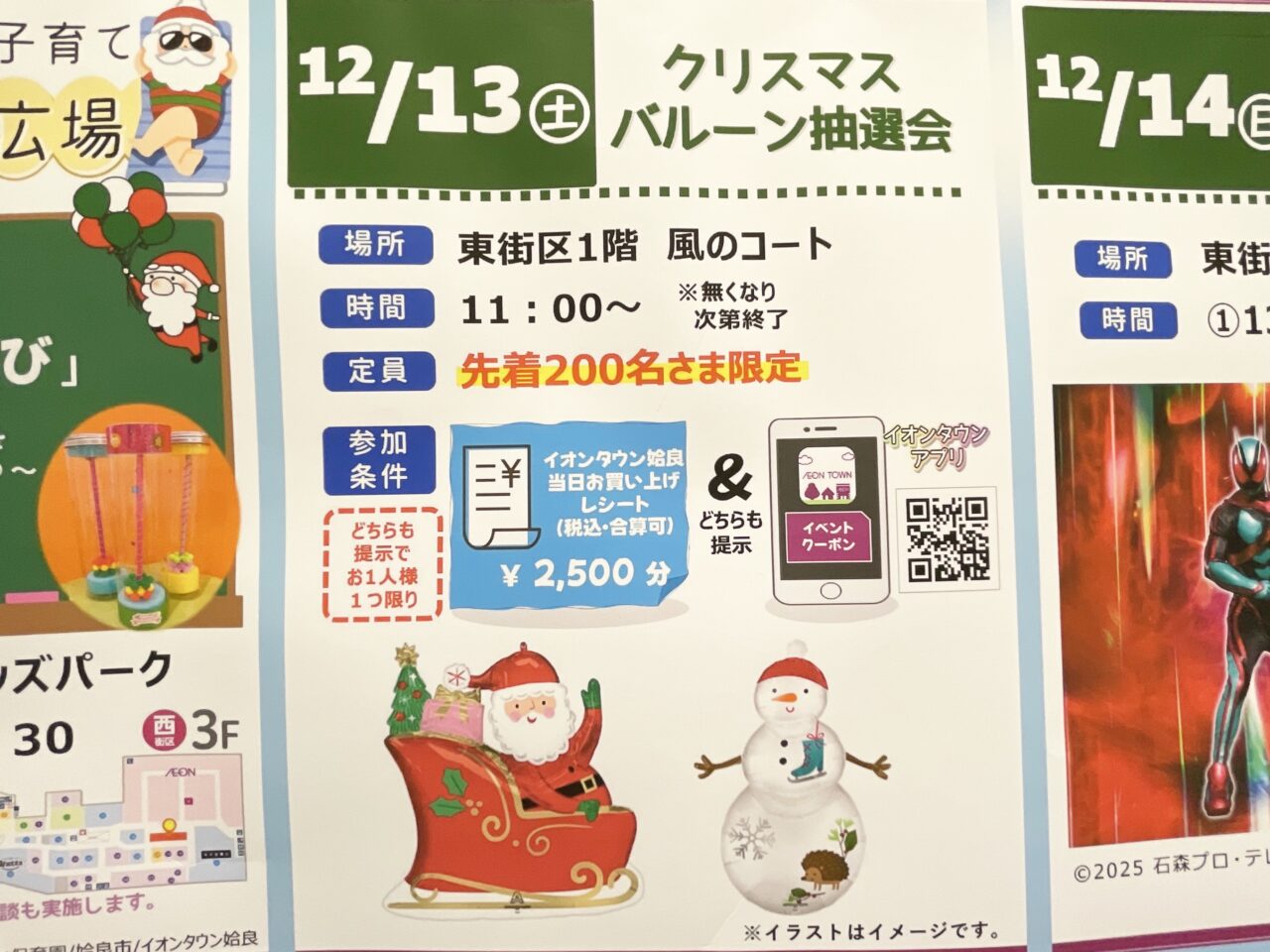前日の12月13日(土)には、「クリスマスバルーン抽選会」も行われます。イオンタウン姶良専門店での当日お買い上げレシート税込2,500円以上(合算可)と、イオンタウン公式アプリクーポンの両方を提示することで、おひとりさま1回参加ができるそうです。