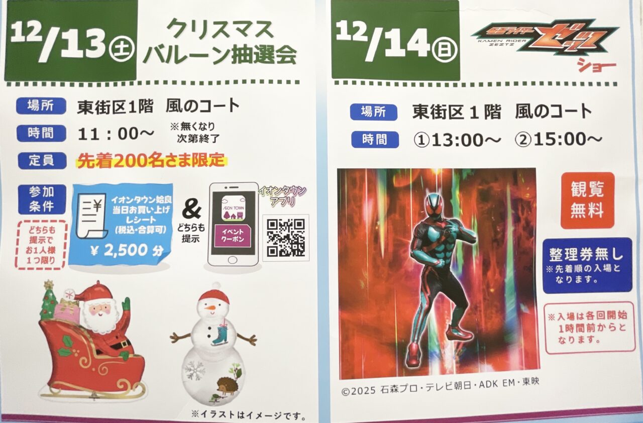 2025年12月14日(日)「イオンタウン姶良」で、「仮面ライダーゼッツショー」が開催されるそうです。大人気のヒーローが姶良市にやってきます。お子様と一緒に観覧してみてはいかがですか。