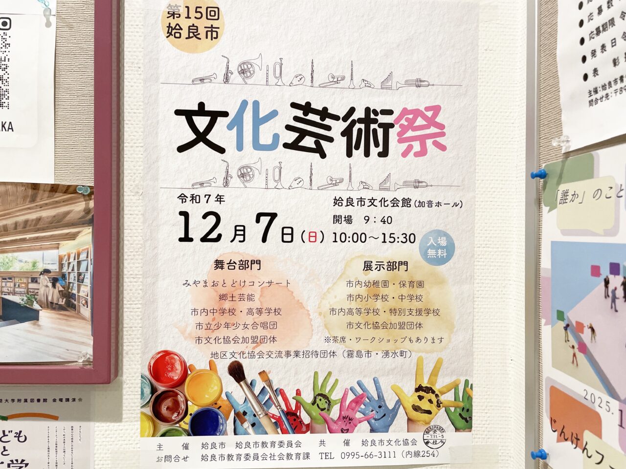 2025年12月7日(日)、「加音ホール」で「第15回 姶良市文化芸術祭」が開催されるそうです。舞台や展示、茶席にワークショップと内容盛りだくさんです。足を運んでみてはいかがでしょう。