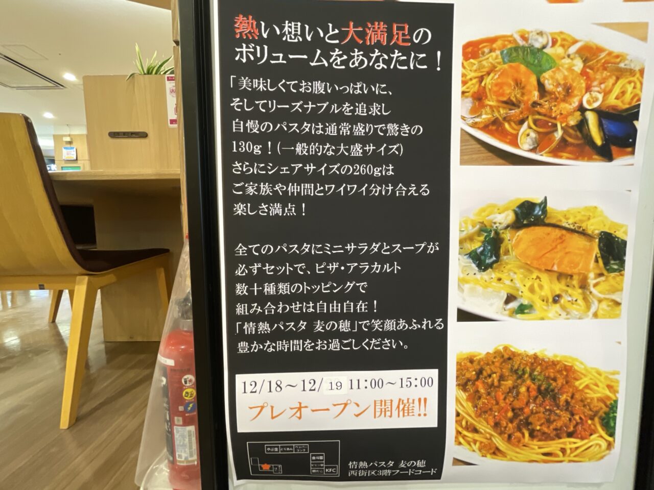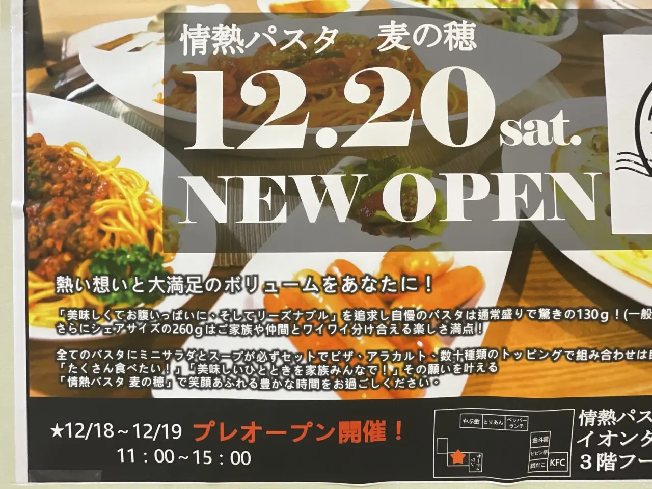 店名は「情熱パスタ 麦の穂」です。パスタ屋さんがオープンするんですね。正式なオープン日は2025年12月20日(土)ですが、2日前の18日(木)にプレオープンするそうです。プレオープン時は11時〜15時が営業時間とのこと。