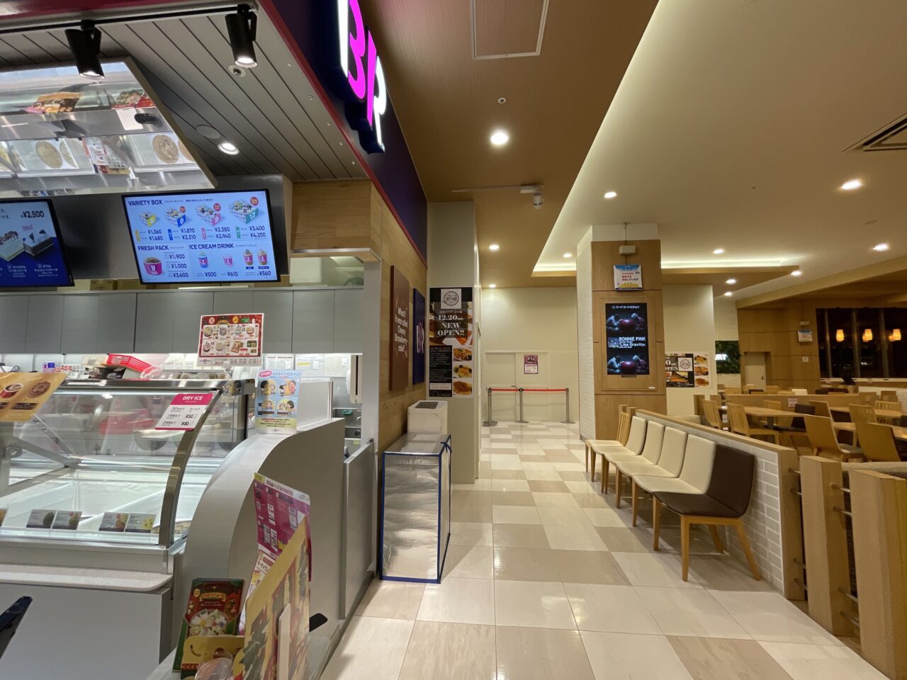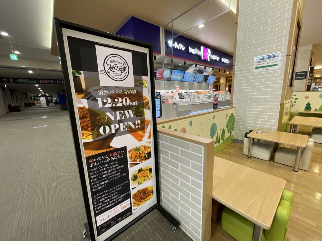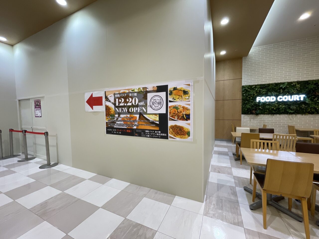 フードコートへ行ってみると、壁にしっかりと張り紙がされ、店名とオープン日がお知らせされていました。