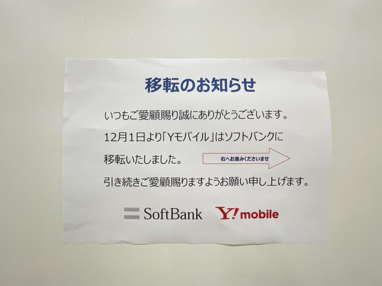 西街区3階にあった「Y! mobile(ワイモバイル)」は、同階にある「ソフトバンク」に移転していました。
