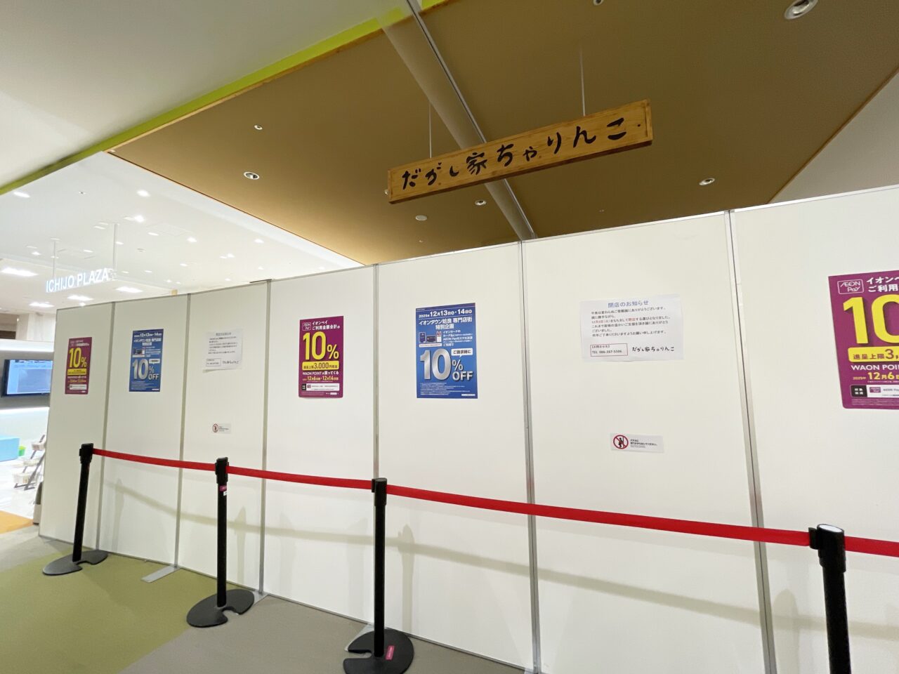 「イオンタウン姶良」内で営業していた2店舗が閉店していました。1店舗目は西街区3階にあった「だがし家ちゃりんこ」です。2025年12月2日(火)に閉店していました。