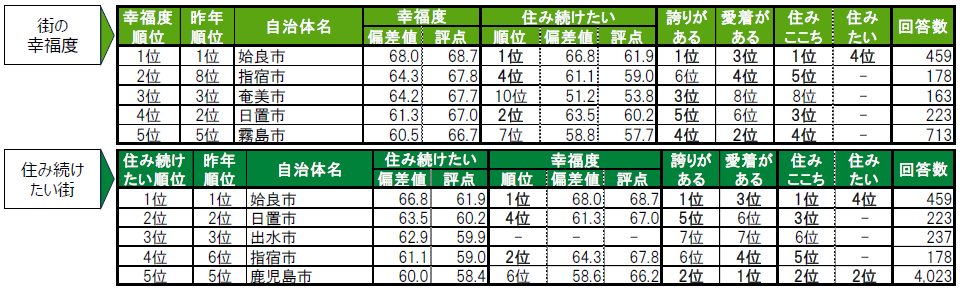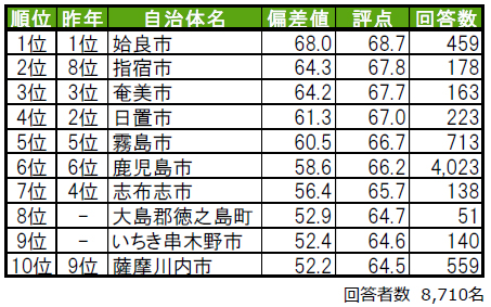 霧島市は、街の幸福度ランキングが5位、住み続けたい街ランキングが7位です。指宿市などの順位が上がりました。