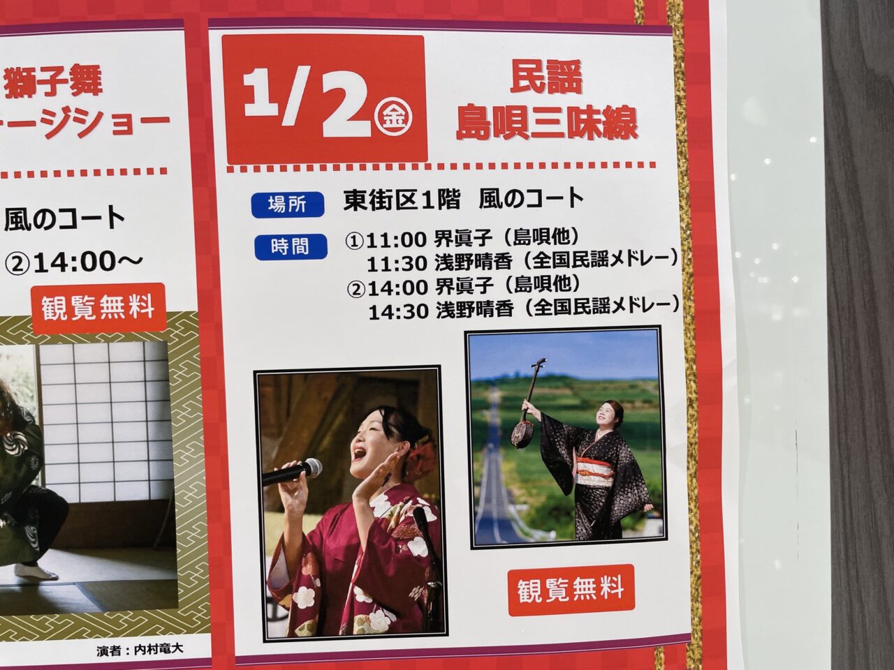 2026年1月2日(金)には「民謡 島唄三味線」も披露されます。観覧無料です。