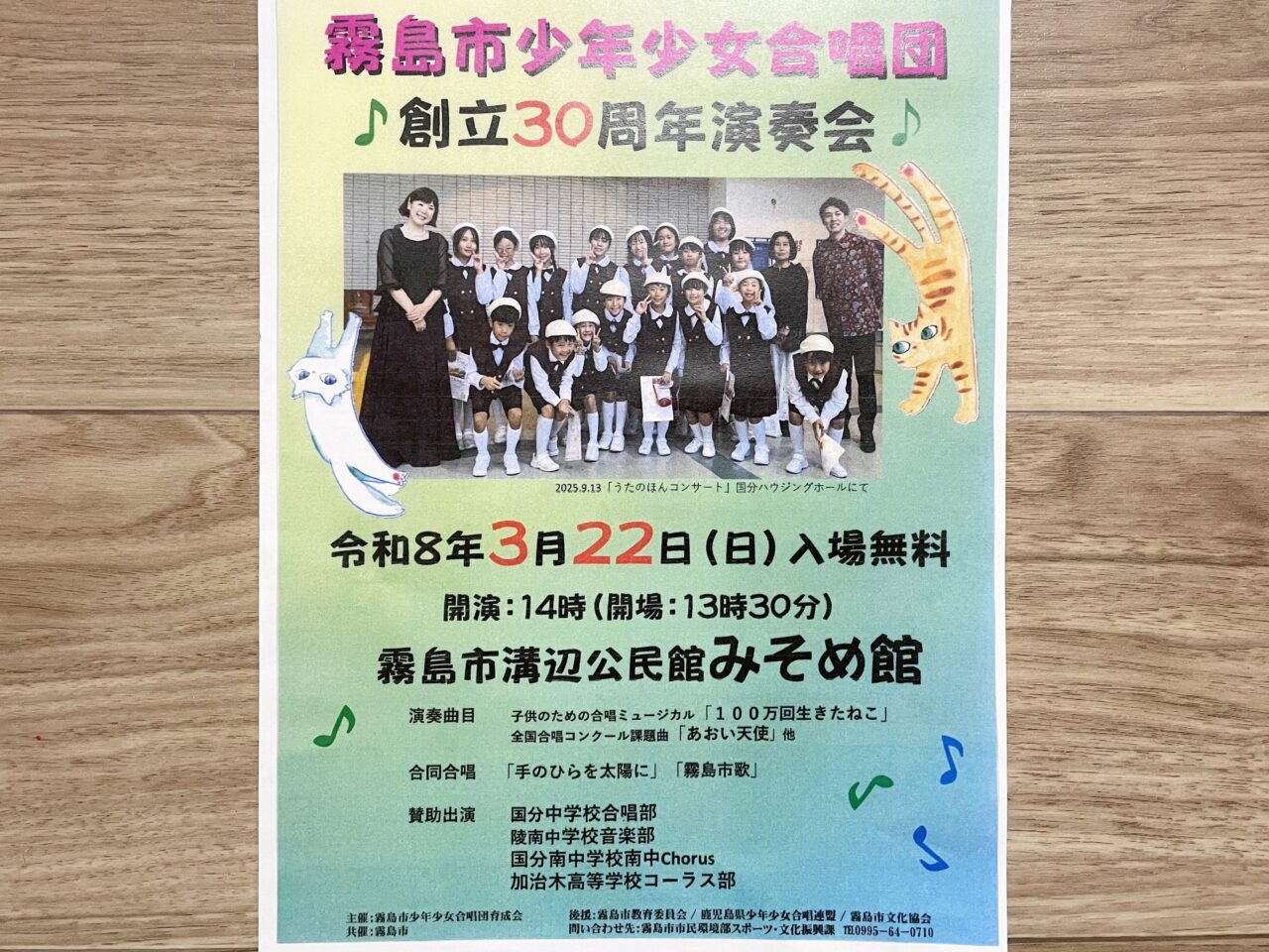 演奏曲目は、子供のための合唱ミュージカル「100万回生きたねこ」、全国合唱コンクール課題曲の「あおい天使」など。賛助出演として、国分中学校合唱部、陵南中学校音楽部、国分南中学校南中Chorus、加治木高等学校コーラス部も出演されるそうです。