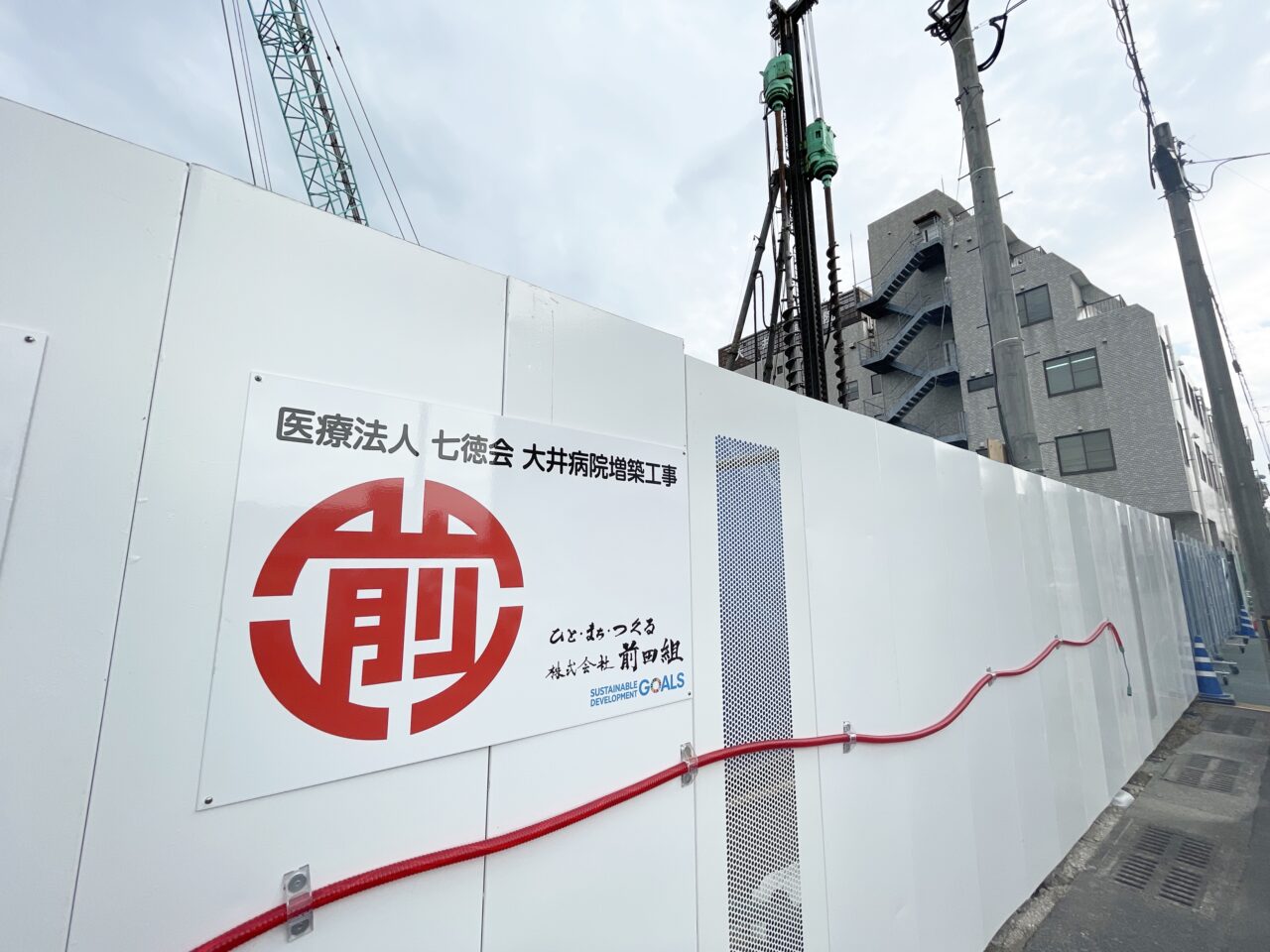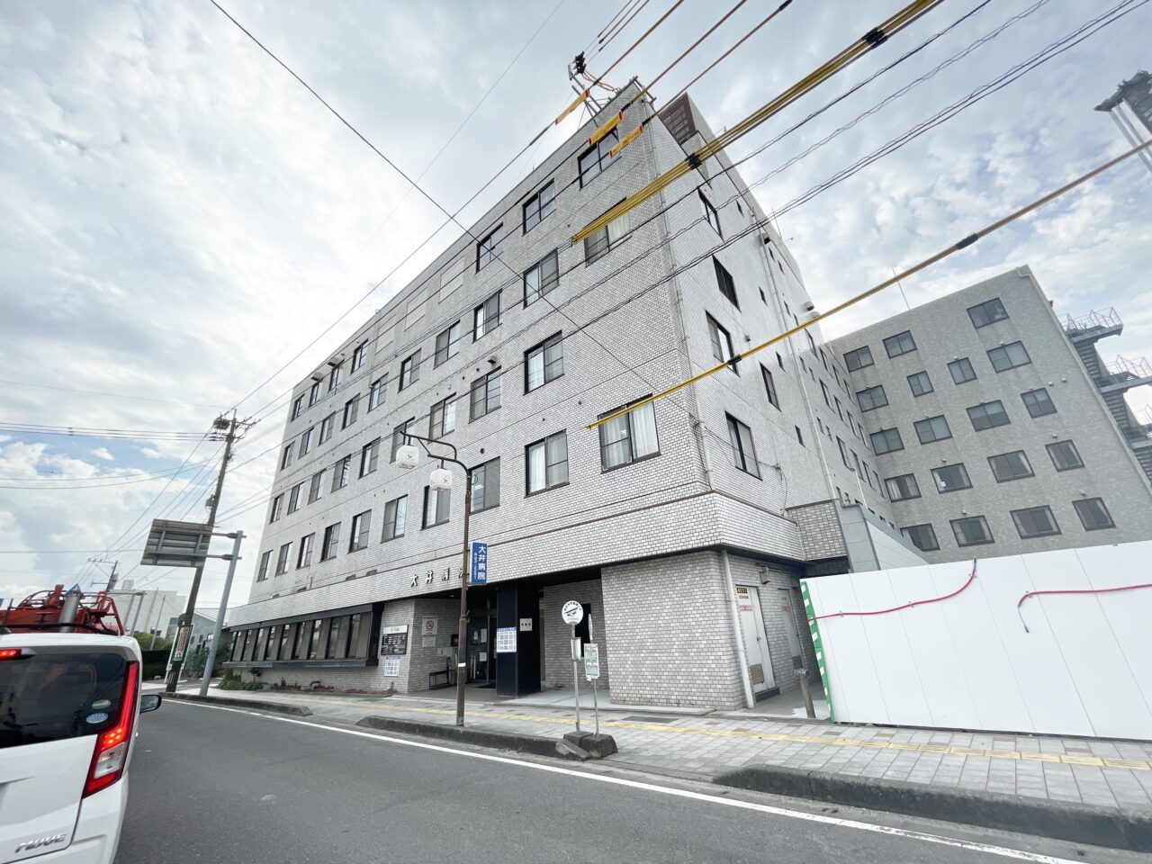 一面しっかりとフェンスで囲まれた中に、大きなクレーン車が目立っています。何が出来るんだろうと看板を確認してみたところ、「大井病院」の増築工事だということがわかりました。