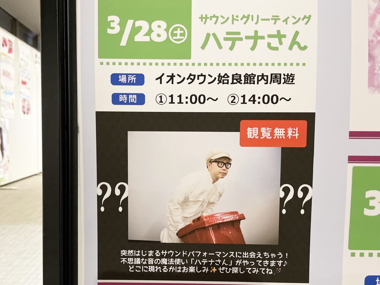 3月28日(土)は、不思議な音の魔法使い「ハテナさん」がサウンドパフォーマンスを披露されます。館内のどこに現れるかはお楽しみとのこと。サウンドの聞こえる方へ探しに行ってみましょう。