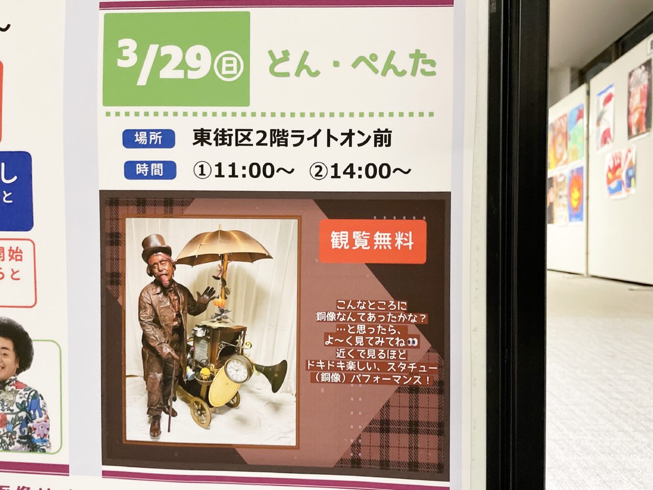 同じく29日(日)、「どん・ぺんた」さんが銅像となって、東街区2階ライトオン前に現れるそうです。動かない大道芸とも言われるスタチューパフォーマンスを、ご覧になってみませんか。