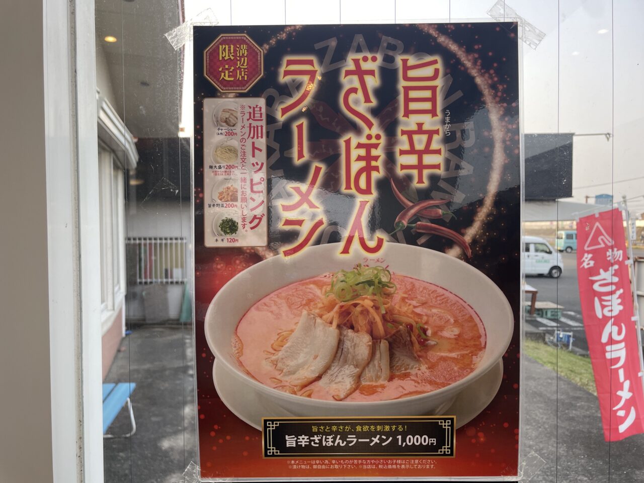 そのメニューとは「旨辛ざぼんラーメン」です。入口の窓に大きく宣伝されていました。溝辺店限定と記載されています。