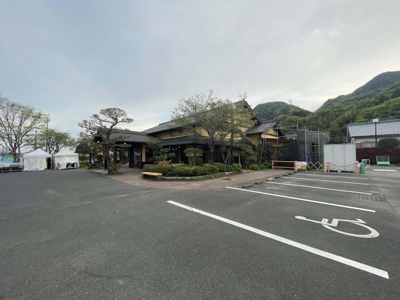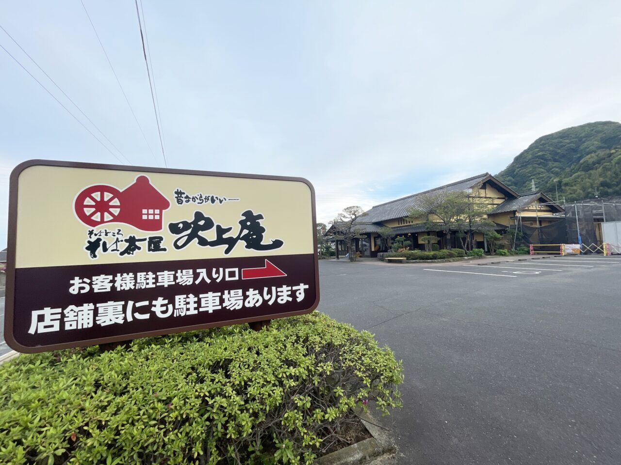「そば茶屋吹上庵 姶良店」の前を通った際、車がほとんど止まっておらず違和感がありました。ふと目をやると、駐車場入口付近に大きなパネルが立ててあり、その理由が判明しました。